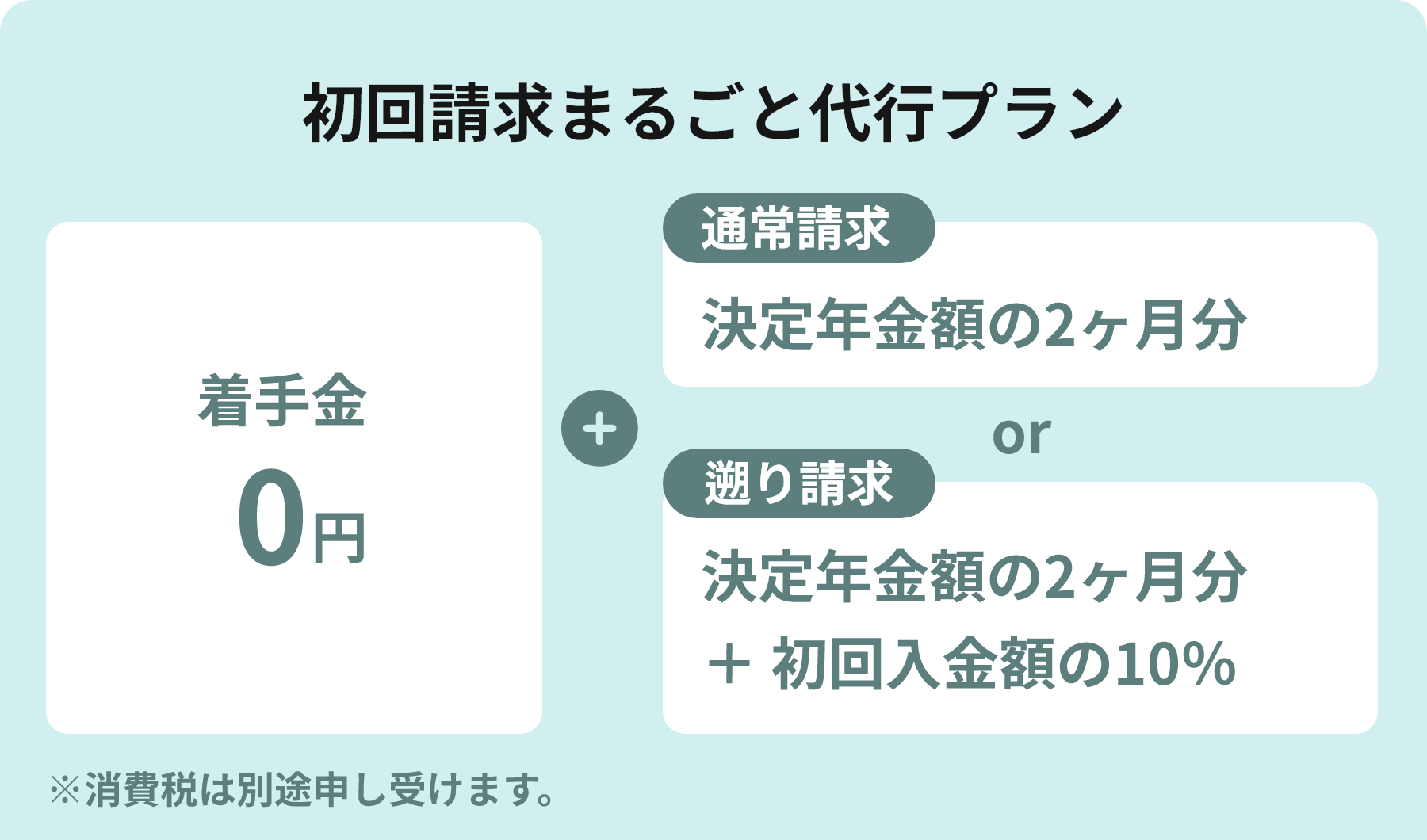 支給決定された障害年金の「月額(加算を含む)」の2ヶ月分を基準としています。たとえば月額10万円の年金が決定した場合、報酬は20万円(税別)となります。