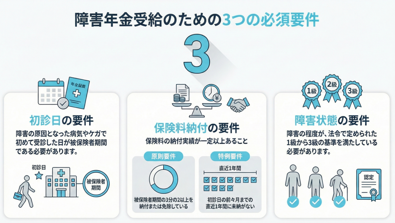 障害年金の受給には、3つの要件を満たしている必要があります。