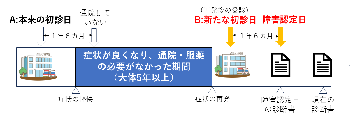 こうした状態が続いていた場合には、「いったん治癒した」とみなされ、症状が再発して通院を再開した際には、その再受診日を新たな「初診日」として取り扱うことが可能になります。