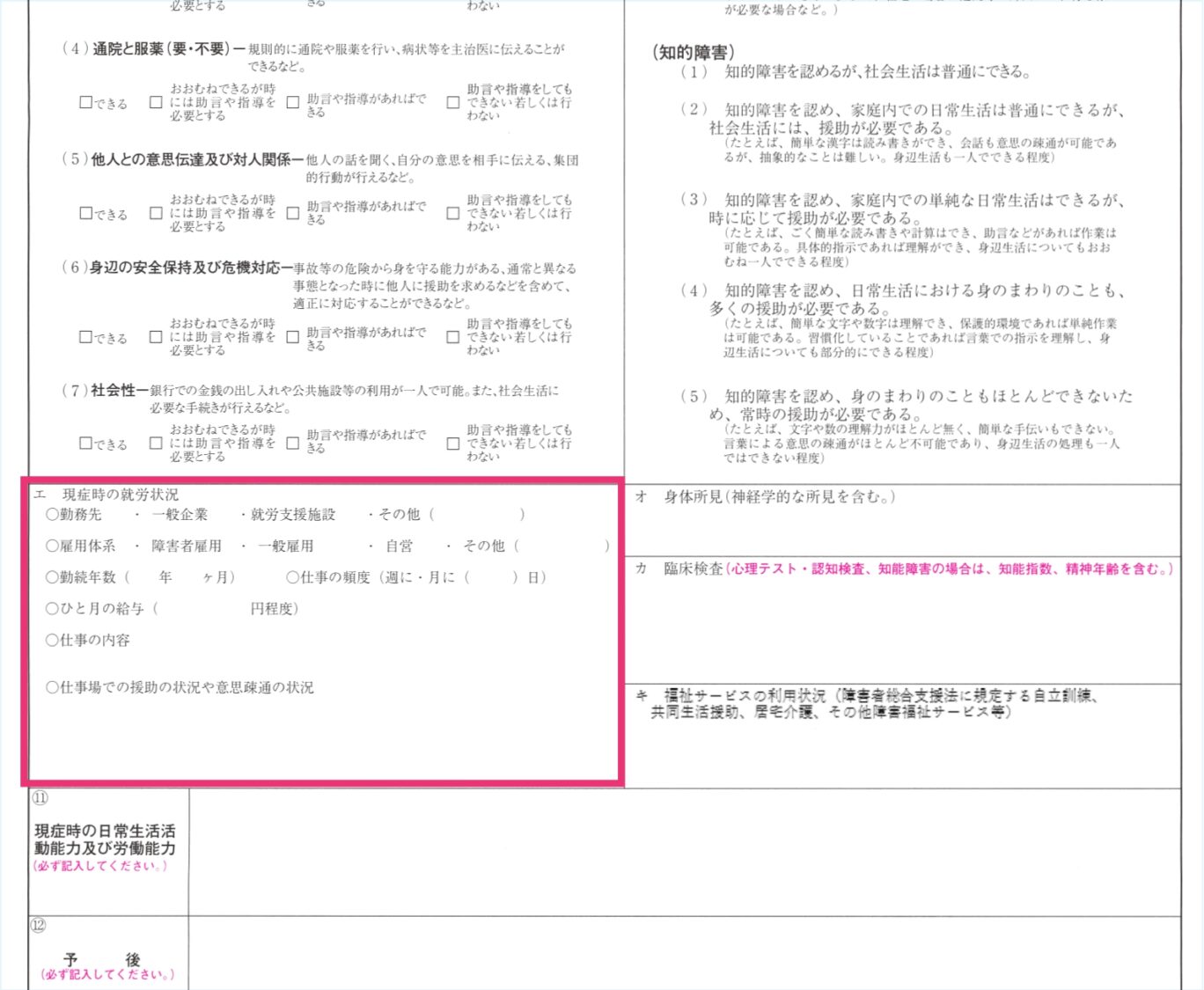 実際、診断書に就労の状況を詳しく記載する欄があるのは、精神障害の診断書だけです。仕事内容や雇用形態、出勤頻度などが細かく問われており、働いているかどうかが等級の判定に影響しやすいという特徴があります。