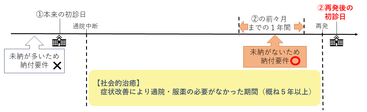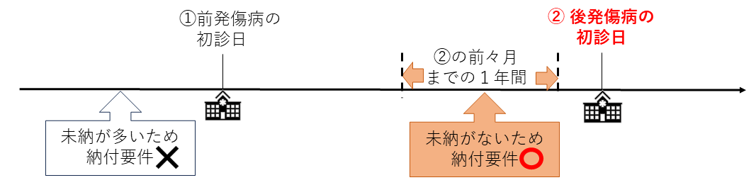 すでにご紹介した通り、初診日の前日時点において、初診日が属する月の前々月までの1年間に保険料の未納がなければ、たとえそれ以前に未納期間が多くあっても、納付要件を満たしたとみなされます。